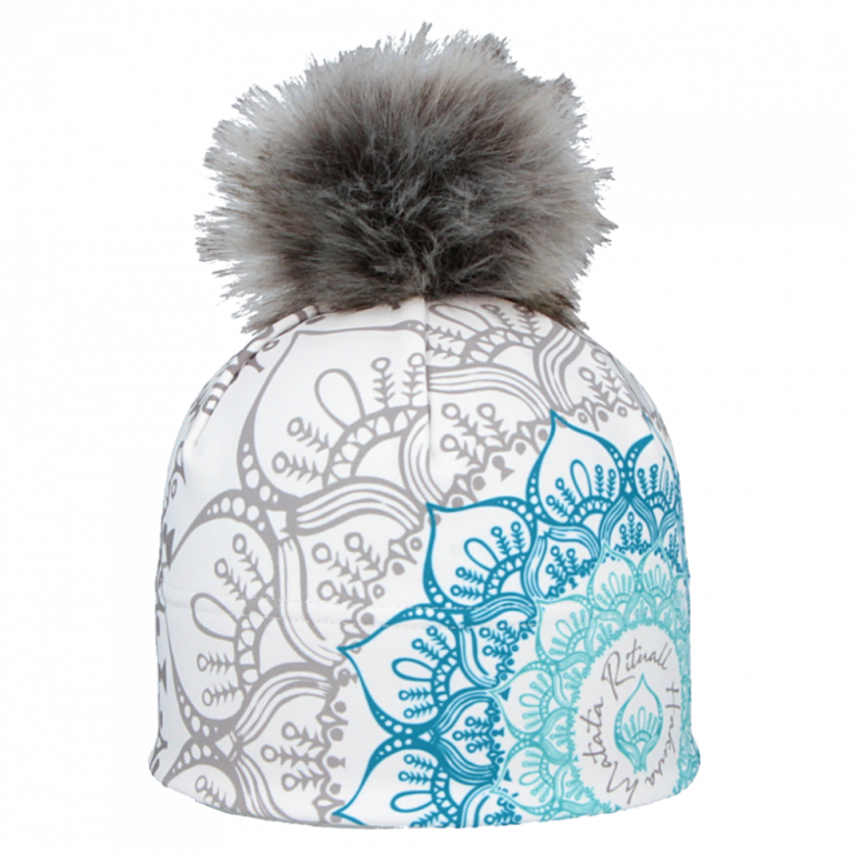 Rituall čepice MANDALA, barva bílá/tyrkysová. Čepice z oboustranně pružného thermomateriálu Stelvio s vnitřní integrovanou počesanou vrstvou. Materiál pochází z EU. Jedná se o jednovrstvou čepici, která je podšitá v čelenkové části další počesanou vrstvou materiálu.   Nahoře je odšitá šesti záševky... celý popis
